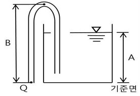 65. 그림과 같이 수심 A인 수조에 직경 12 cm인 사이폰(syphon)이 설치되어 있다. 관의 최하단은 수조의 바닥 기준면과 같은 높이이다. 유출구 Q로부터 사이폰의 정점까지의 높이가 B일 때, 다음 중 사이폰을 통해 흐르는 유속이 가장 큰 경우는? (단, 에너지손실은 무시한다.)