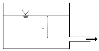 66. 그림과 같이 수조의 벽에 작은 오리피스를 뚫어 물을 유출시킬 때, 수심(H)이 4배 증가하면 오리피스에서 유출되는 유속은 어떻게 변하는가? (단, 수조내의 수심은 일정하게 유지하는 것으로 가정한다.)