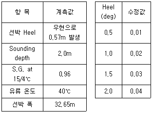 7. 선박의 No.2 FOT(C)의 유류에 대한 사운딩 작업 후 아래의 정보를 얻었다. 힐(Heel) 수정 테이블을 이용하여 보정한 Sounding depth(m)는?