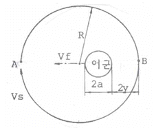34. 어느 외두리 건착어선이 다음 그림과 같이 A점에서 투망을 시작하여 B점을 통과할 때 어군이 그물을 인식하고 A점을 향해 이동했다고 한다. 이 선박의 적정어구의 길이는? (단, 어군의 유영속도 Vf : 1m/s, 어군의 그물 인지거리 2y : 50m, 어군의 폭 2a : 50m, 선박의 투망속도 Vs : 6m/s)