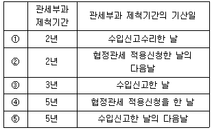 29. 자유무역협정의 이행을 위한 관세법의 특례에 관한 법률에 의해 협정관세를 적용한 후 협정관세 적용 제한사유가 발견되어서, 세관장이 납부하여야 할 세액과 납부한 세액의 차액을 부과 징수함에 있어 적용할 관세부과 제척기간과 제척기간의 기산일은?(문제 오류로 확정답안 발표시 모두 정답처리 되었습니다. 여기서는 1번을 누르면 정답 처리 됩니다.)