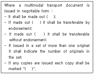 12. 국제물품복합운송에 관한 유엔협약(1980) 제6조 '유통성 복합운송서류(Negotiable Multimodal Transport Document)'에 관한 규정이다. ( )안에 들어갈 용어를 순서대로 바르게 나열한 것은?