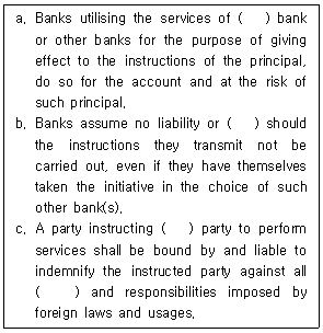 21. 추심에 관한 통일규칙(URC 522) 제11조 '지시받은 당사자의 행위에 대한 면책(Disclaimer for Acts of an Instructed Party)'에 관한 내용이다. ( ) 안에 들어갈 용어를 순서대로 바르게 나열한 것은?