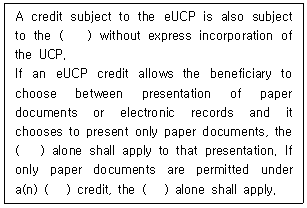 39. 전자적 제시를 위한 UCP추록(eUCP Version 1.1) 제e2조 'UCP에 대한 eUCP의 관계(Relationship of the eUCP to the UCP)'에 관한 규정이다. ( )에 들어갈 용어를 순서대로 바르게 나열한 것은?