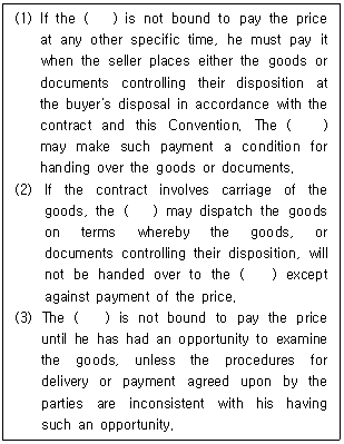 5. 국제물품매매계약에 관한 유엔협약(CISG, 1980) 제58조의 내용이다. ( )에 들어갈 용어를 순서대로 바르게 나열한 것은?