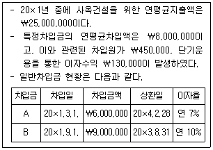 15. (주)세관은 20×1년 3월 1일 사옥 건물을 착공하였다. 동 건물은 20×3년 9월 1일에 완공되었으며, 차입원가 자본화의 적격자산에 해당한다. 다음 자료를 이용하여 (주)세관이 20×1년에 자본화할 차입원가를 계산하면 얼마인가? (단, 이자는 월할계산한다.)