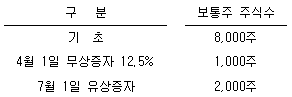 7월 1일 유상증자 시 주당 발행금액은 ₩10,000이고, 유상증자 직전 주당 공정가치는 ₩20,000이다. (주)관세의 20×1년도 기본주당이익 계산을 위한 가중평균유통보통주식수는? (단, 가중평균유통보통주식수는 월할계산한다.)