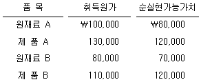 23. (주)관세의 기말 재고자산 현황은 다음과 같다. 품목별 저가법을 적용할 경우 기말 재고자산 금액은 얼마인가? (단, 원재료A를 투입하여 제품A가 생산되고, 원재료B를 투입하여 제품B가 생산된다.)