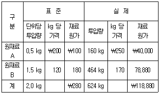 33. (주)관세는 표준원가계산제도를 채택하고 있으며, 원재료 A와 원재료 B를 투입하여 제품을 생산하고 있다. (주)관세는 20×1년에 300단위의 제품을 생산하였으며, 직접재료에 대한 원가자료는 다음과 같다. 직접재료원가의 수율 차이는?