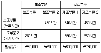 40. (주)관세의 보조부문과 제조부문은 각각 두 개의 부문으로 구성되어 있다. 보조부문 1은 노무시간을, 보조부문 2는 기계시간을 기준으로 각 보조부문의 원가를 배부한다. 부문간 용역수수관계와 부문별 발생원가는 다음과 같다.