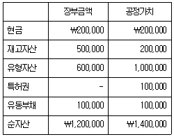 29. (주)관세는 (주)대한의 지분 100%를 현금으로 인수(사업결합)하였는데, 인수일 현재 (주)대한의 식별가능한 자산과 부채의 장부금액과 공정가치는 다음과 같다. 다음 설명 중 옳지 않은 것은?