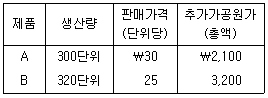 34. (주)관세는 균등이익률법을 적용하여 결합원가계산을 하고 있다. 당기에 결합제품A와 B를 생산하였고, 균등매출총이익률은 30%이다. 관련 자료가 다음과 같을 때 결합제품A에 배부되는 결합원가는? (단, 재공품 재고는 없다.)