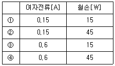 11. 5[kVA], 50[Hz] 단상변압기에 1차전압 3,000[V]를 인가하여 무부하 운전 중이다. 여자어드미턴스와 여자컨덕턴스가 각각 5×10-5[℧]와 5×10-6[℧]일 때, 여자전류[A]와 철손[W]은? (단, 권선저항과 누설리액턴스는 무시한다)
