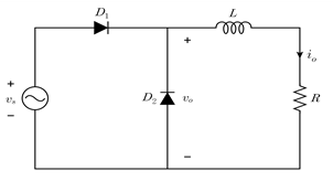 [V]이고, 부하저항 R이 10[Ω]일 때, 부하전류 io의 평균값[A]은? (단, 다이오드는 이상적으로 동작하며, 부하인덕턴스 L은 매우 크다)