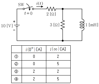 10. 그림의 회로에서 스위치 SW가 t=0에서 동작하여 닫힌 상태를 유지할 때, 초기 전류 i(0+)[A]와 정상 상태 전류 i(∞)[A]는? (단, 인덕터의 초기 전류는 0이다)