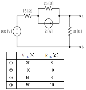 15. 그림의 회로에서 단자 a-b의 테브난 등가 전압 VTh[V]와 테브난 등가 저항 RTh[Ω]는?