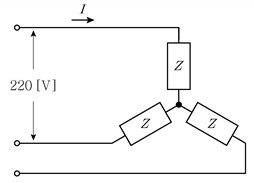 4. 그림의 평형 3상 회로에서 선간전압이 220[V]이고 한 상의 임피던스가 Z=4+j3[Ω]일 때, 선전류 I[A]는? (단, 전압과 전류는 실횻값이다)