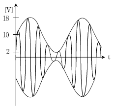 10. 다음 그림은 AM 변조된 DSB-LC(Double-Side-Band Large-Carrier) 파형이다. 변조 지수(modulation index)를 m이라 하고, 총 송신 전력 중 캐리어가 차지하는 전력의 비율을 R이라고 할 때, m과 R을 구하면? (단, 그림에서 캐리어 주파수는 신호보다 매우 높다고 가정한다) (순서대로 m, R)