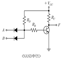 2. 정논리(positive logic)를 적용할 때, 논리게이트에 대한 트랜지스터 회로의 표현으로 옳지 않은 것은? (단, A, B는 입력이고 F는 출력이다)