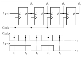 18. 다음 4비트 시프트 레지스터 회로에서 입력신호 Clock, Input이 인가되었을 때, 구간(t4~t5)에서 출력 Q0Q1Q2Q3는? (단, 출력 Q0, Q1, Q2, Q3는 0으로 초기화되어 있고, 게이트에서 전파지연은 없다고 가정한다)