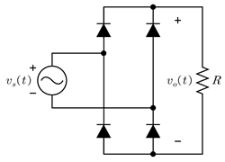 8. 다음 전파정류회로에 대한 설명으로 옳은 것은? (단, 입력전압은 vs(t)=Vmsin(120πt)[V]이고, 다이오드는 이상적이다)