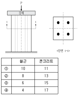13. 그림과 같이 중심축하중 P가 작용하는 철근콘크리트 기둥에서 철근과 콘크리트가 각각 부담하는 축하중의 비는? (단, 콘크리트의 단면적 Ac는 종방향 철근의 전체단면적 Ast의 13배, 철근의 탄성계수 Es는 콘크리트의 탄성계수 Ec의 8배이고, 작용하중은 단면 전체에 균등하게 작용하며, 철근콘크리트 기둥은 철근과 콘크리트가 완전부착되어 선형탄성의 일체거동을 하는 단주이다)