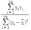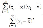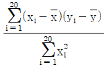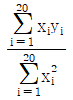 12. 자료 (xi, yi)(i = 1,2,…,20)에 절편이 없는 단순선형회귀모형 yi = βxi + εi 를 적합하려고 한다. β에 대한 최소제곱추정량은? (단, xi는 서로 다르다)
