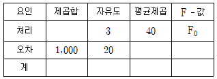 16. 다음은 반복 수가 같은 일원배치법으로부터 얻은 분산분석표의 일부이다. 처리 효과가 없다는 귀무가설을 유의수준 5%에서 검정하는 방법으로 옳은 것은? (단, Fα(k1,k2)는 분자와 분모의 자유도가 각각 k1, k2인 분포의 제100×(1-α) 백분위수를 나타내고, F0.95(3, 20) = 0.12, F0.95(20, 3) = 0.32, F0.05(20, 3) = 8.66 이다)