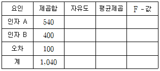 3. 컴퓨터 부품의 품질은 두 인자 A, B에 따라 달라질 수 있다고 한다. 다음은 인자 A의 3가지 수준과 인자 B의 6가지 수준의 가능한 18가지 실험 조건에서 무작위 순서로 한 개씩 부품을 생산한 후, 부품의 품질을 수치화하여 얻은 분산분석표의 일부이다. 인자 A의 수준에 따라 부품의 품질에 차이가 있는지를 검정하기 위한 F-검정통계량의 값은?