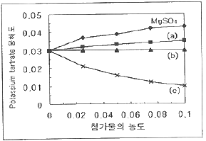 24. 다음은 Potassium tartrate의 용해도가 첨가물의 농도에 따라 어떻게 변화되는가를 나타내는 그림이다. 그림의 (a), (b), (c)는 각각 어떤 첨가물로 예상할 수 있는가? (단, 첨가물은 NaCl, Glucose, KCl이다.)