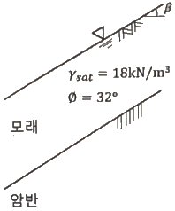 78. 그림과 같이 c=0인 모래로 이루어진 무한사면이 안정을 유지(안전율≥1)하기 위한 경사각(β)의 크기로 옳은 것은? (단, 물의 단위중량은 9.81kN/m3이다.)