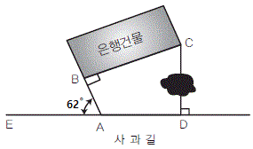 90. 그림과 같이 "사과길"로부터 은행건물의 위치를 정확히 알고자 다음과 같은 측량결과를 얻었다. CD의 거리는? (단, ∠EAB=62°, AB=7.40m, BC=10m, ∠ABC=∠ADC=90°)