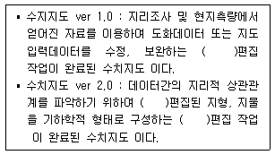 76. 다음은 수치지도 ver 1.0 및 ver 2.0에 대한 설명이다. 괄호 안에 들어갈 알맞은 용어를 순서대로 나열된 것은?