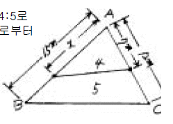 40. △ABC의 면적을 그림과 같이 4:5로 분할하려고 한다. 분할점은 A로부터 얼마거리로 해야 하는가?