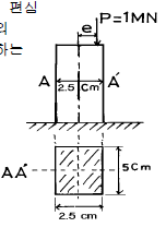 11. 그림과 같은 단주(短注)에서 편심 거리 e=2 mm에 하중 P=1 MN의 압축하중이 작용할 때 발생하는 최대응력은 몇 MPa인가?