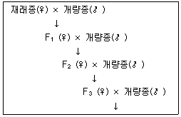 3. 다음과 같은 방식의 잡종 교배 방법으로 불량한 재래종 가축의 능력을 단시간에 효과적으로 개량하는 데 이용될 수 있는 교배 방법은?