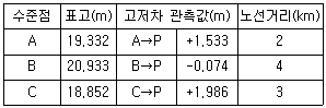 23. 수준점 A, B, C에서 수준측량을 한 결과가 표와 같을 때 P점의 최확값은?