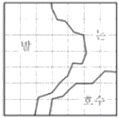 33. 그림은 어느 지역의 토지 현황을 나타내고 있는 지도이다. 이 지역을 촬영한 7×7 영상에서 "호수"의 훈련지역(training field)을 선택한 결과로 적합한 것은?