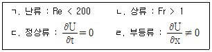 32. 유체 흐름의 종류에 관한 설명으로 옳은 것을 모두 고른 것은? (단, Re는 레이놀즈 수, Fr은 프루드 수, U는 유속, t는 시간, x는 흐름방향 길이이다.)