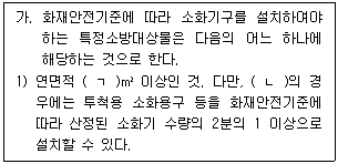 62. 소방시설 설치 및 관리에 관한 법령상 특정소방대상물의 관계인이 특정소방대상물에 설치·관리해야 하는 소방시설의 종류 중 소화설비에 관한 조문의 일부이다. ( )에 들어갈 내용으로 옳은 것은?