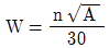 11. 표준게이트의 폭(W)을 결정하는 공식을 알맞게 표현한 것은? (단, n=수지상수, A=성형품 외측의 표면적(mm2)이다.)