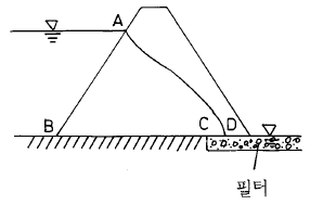 78. 다음의 흙댐에서 유선망을 작도하는데 있어 경계조건이 틀린 것은?