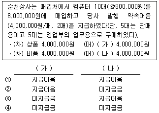 4. 다음의 순천상사의 거래를 분개할 경우 ( 가 )와 ( 나 )에 들어갈 계정과목으로 올바르게 짝지어진 것은?