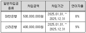 5. 다음은 ㈜아윤의 신축건물 건설과 관련된 자료이다. 당사의 결산일은 12월 31일이다. 2025년도 공사대금평균지출액(공사기간:2025.4.1.~2025.12.31.)은 500,000,000원이다. 특정차입금은 700,000,000원(연이자율 10%, 차입기간:2025.4.1.~2025.12.31.)이며 일반차입금은 아래 자료와 같다. 2025년도에 일반차입금의 자본화대상 차입원가는 얼마인가? (단, 이자비용은 월할상각한다.)