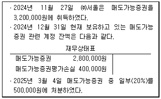3. 다음은 ㈜서울이 보유하고 있는 매도가능증권(시장성 있음)의 취득, 평가 및 처분에 대한 내용이다. ㈜서울의 2025년 매도가능증권 처분손익은 얼마인가?