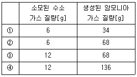 2. 2mol의 질소 가스(N2)가 수소 가스(H2)와 비가역적으로 반응하여 모두 암모니아 가스(NH3)로 전환되었을 때, 소모된 수소 가스와 생성된 암모니아 가스의 질량[g]을 바르게 연결한 것은? (단, 질소(N)와 수소(H)의 원자량은 각각 14와 1이다)