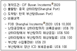 119. (주)신라상사가 중국의 (주)난징상사와 수입계약을 체결하였다. 다음과 같은 조건일 때, 매수인인 (주)신라상사가 지불해야 하는 수입가격은?