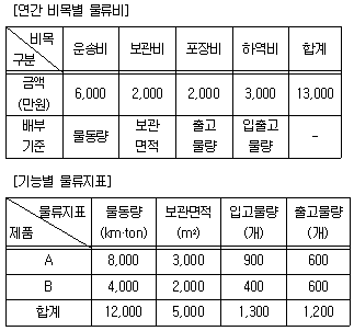 15. 다음 표는 제품 A와 제품 B를 취급하는 물류업체의 연간 비목별 물류비와 기능별 물류지표에 관한 자료이다. 이에 관한 설명으로 옳은 것은? (단, 자료에서 제시한 것 외의 사항은 고려하지 않는다.)
