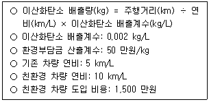 40. A국가는 이산화탄소 배출량(kg)에 비례해서 환경부담금을 부과하고 있다. K사는 환경부담금을 절감하기 위해 기존 차량 매각 후 친환경 차량 도입을 검토하고 있다. 연비법에 의한 이산화탄소 배출량 및 환경부담금 산출 관련 자료가 다음과 같을 때, 친환경 차량 도입이 경제적으로 불리하지 않다는 판단을 내리기 위한 최소 주행거리(km)는? (단, 제시된 조건 이외의 사항은 고려하지 않음)