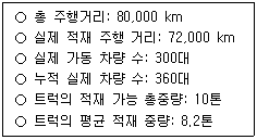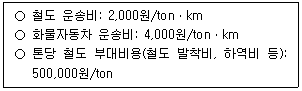 52. 다음과 같은 화물자동차 운송과 철도 운송 조건에서 채트반(Chatban) 공식을 이용한 두 수송수단간 경제효용거리 분기점은?
